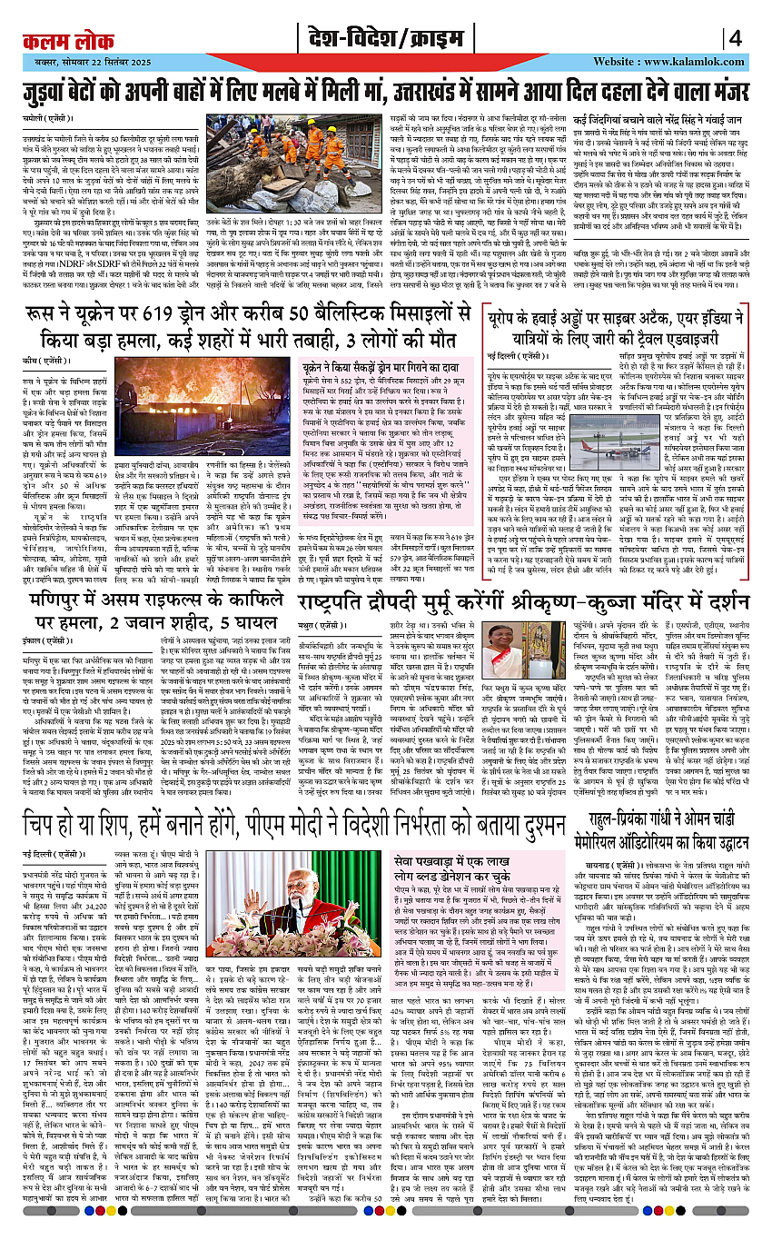 Kalam Lok is a Hindi e-paper newspaper that provides readers with news, analysis, and local updates. Language Hindi, Electronic Paper (Epaper), accessible online. Covers a wide range of topics including. Breaking News, In-depth Analysis, Local Updates, Politics, Business, Sports, Entertainment. Daily editions are available online. You can typically browse through pages, zoom in on content, and navigate between articles. The e-paper maintains an archive of past editions, allowing readers to access previous news.